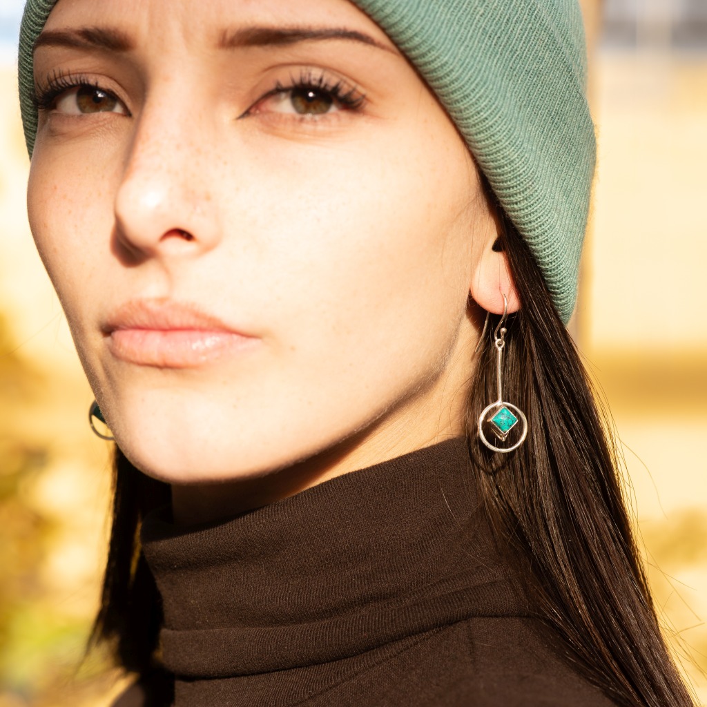 - Diseño: Pendiente colgante con barra, aro circular y engaste de turquesa cuadrada
